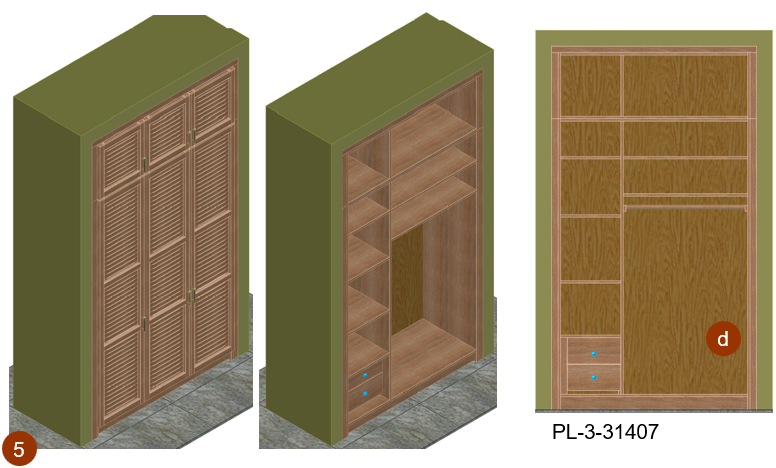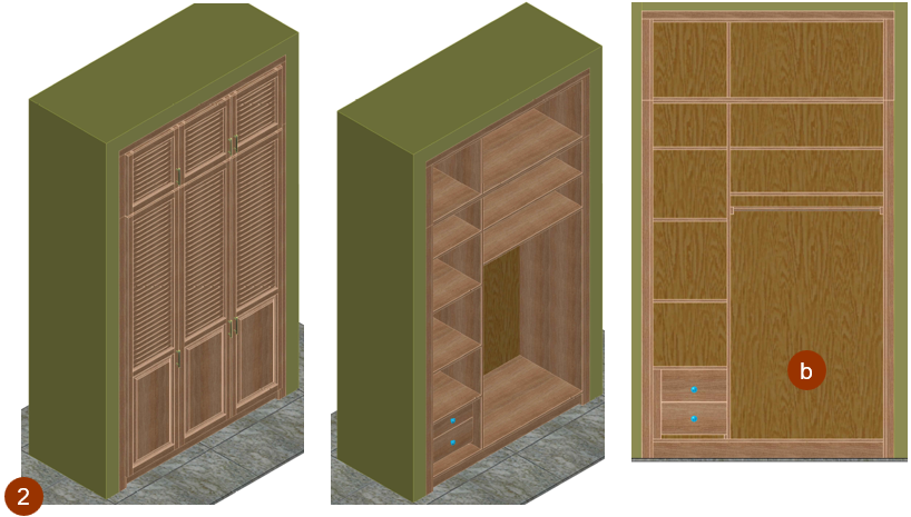 2 sections, avec étagères et portes pivotantes à 3 battants par module