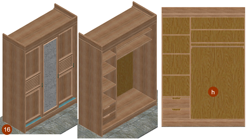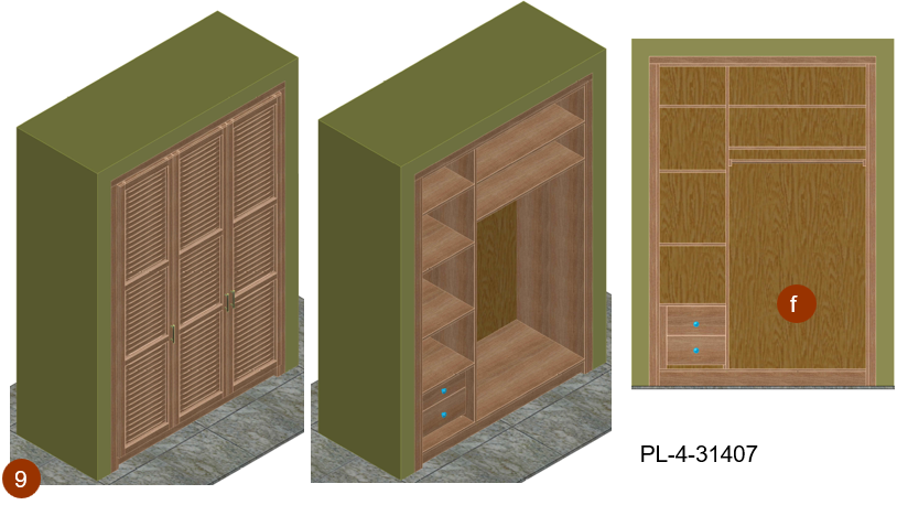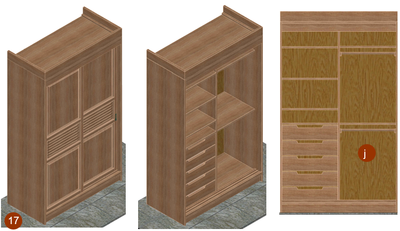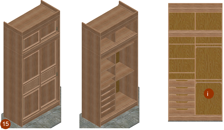 2 sections, tiroirs intérieurs et portes coulissantes à 3 battants