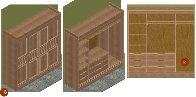 3 sections, tiroirs intérieurs et portes coulissantes à 4 battants