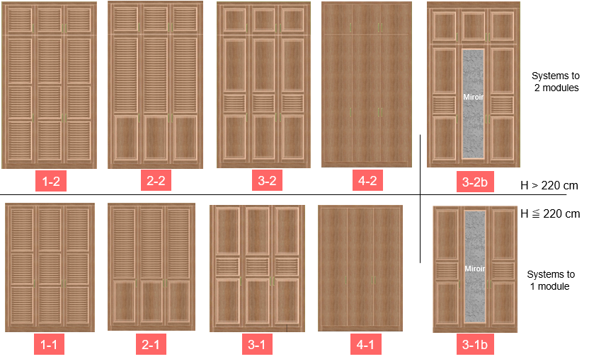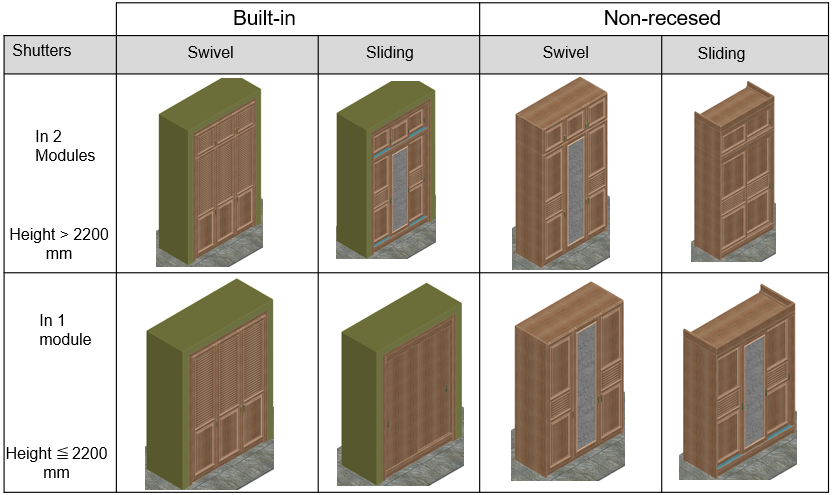 Our cupboards and cabinets fit into the spaces provided. Our technology distinguishes cupboards into built-in or non-built-in cupboards and one-module or two-module cupboards depending on the total height.