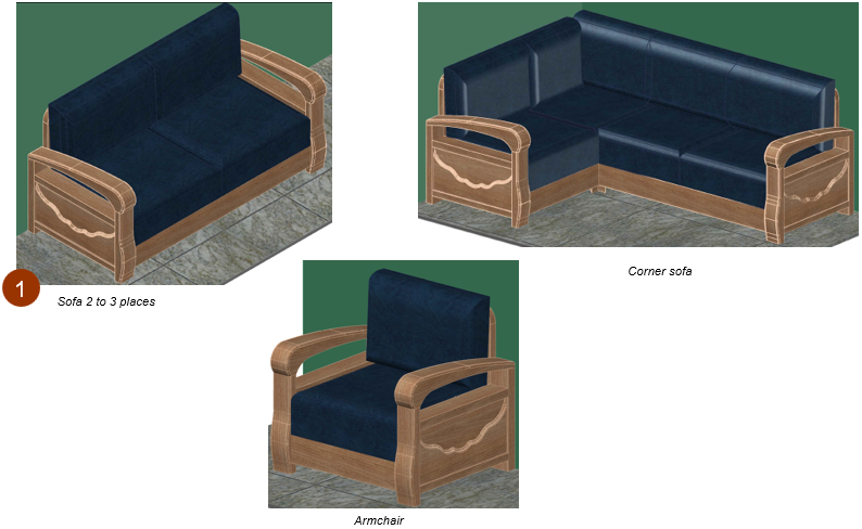 The upholstery can be made in fabric, leather or imitation leather. The back and seat are covered with high density foam.