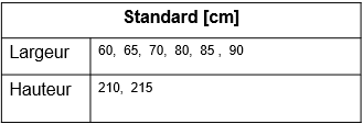 Les portes peuvent également être fabriquées sur mesure, au  cm près , selon une plage dimensionnelle de 200 à 235 cm en hauteur et 60 à 90 cm en largeur.