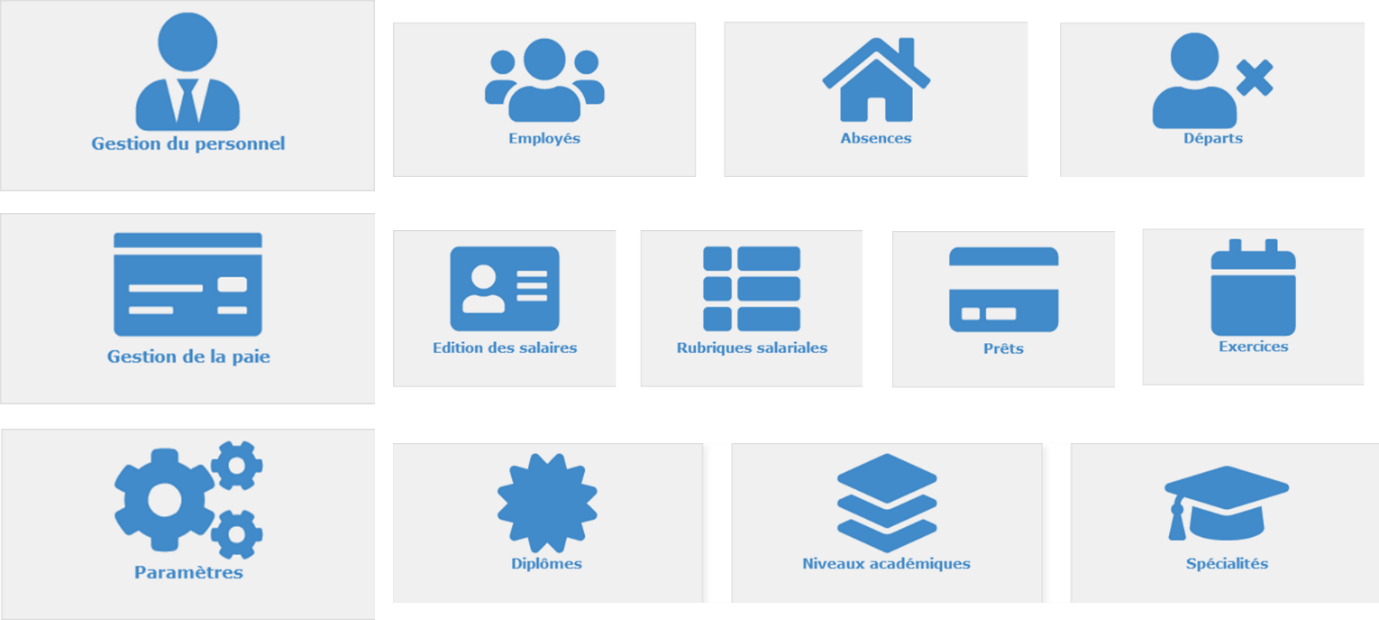 La gestion des ressources humaines comprend la collecte des données personnelles et administratives des employés, le monitoring des retards, des absences et des départs.